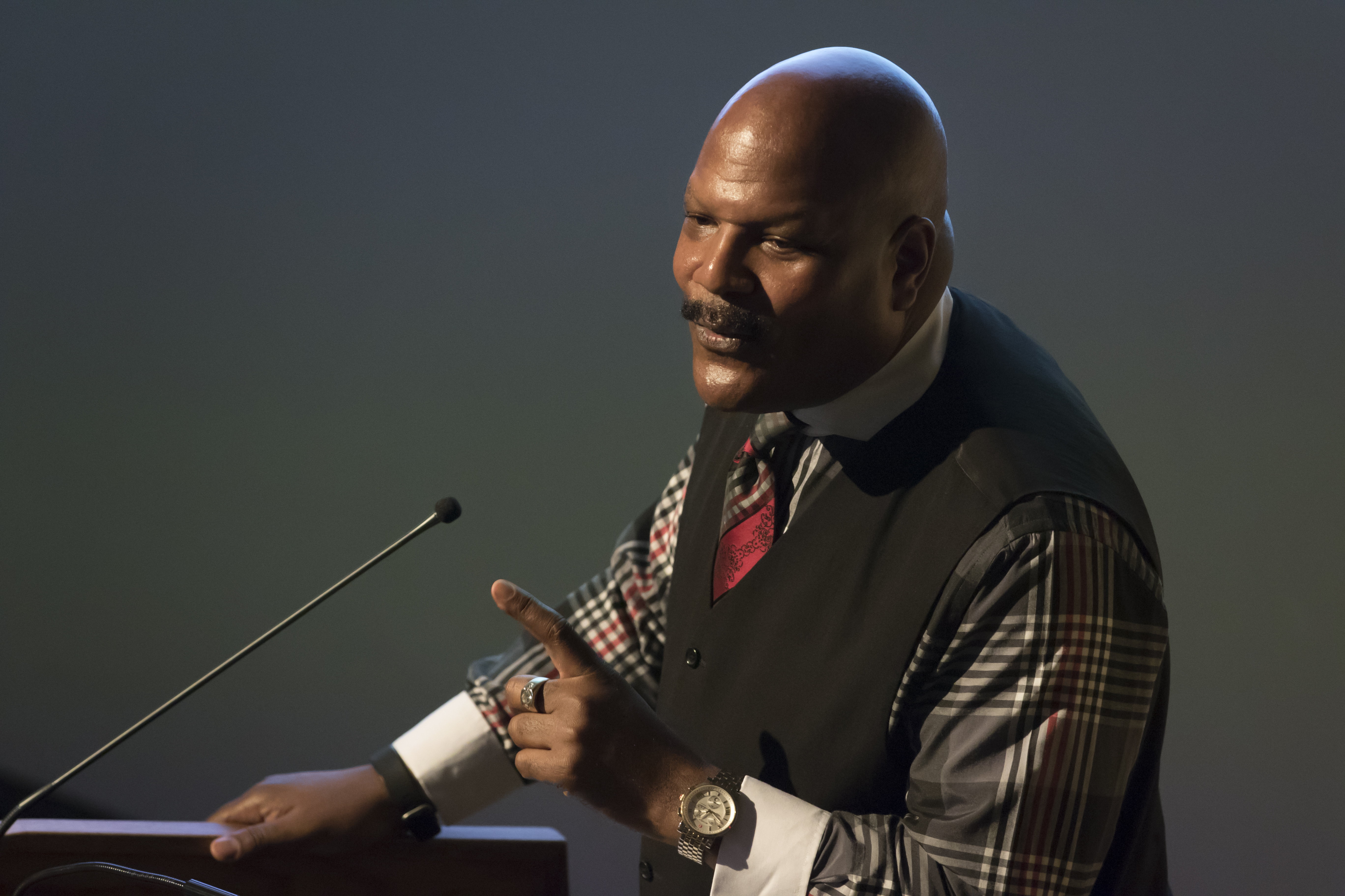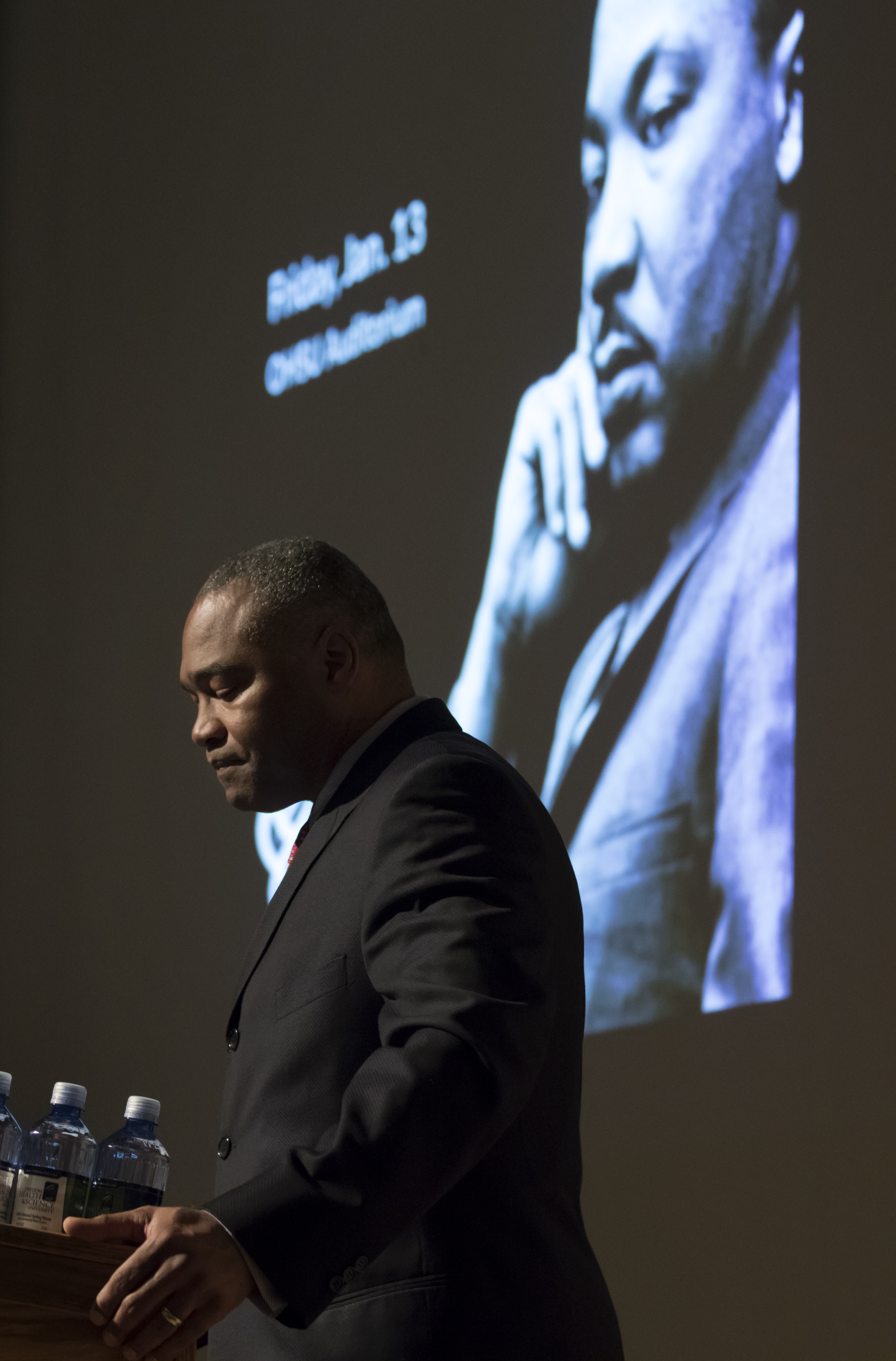 J.W. Matt Hennessee, pastor at Vancouver Avenue First Baptist Church of Portland, was the keynote speaker at an event bringing the OHSU community together to reflect on the legacy of Dr. Martin Luther King, Jr., January 13, 2017. The event was a call to action to continue OHSU's commitment to equity and inclusion. (OHSU/Kristyna Wentz-Graff)