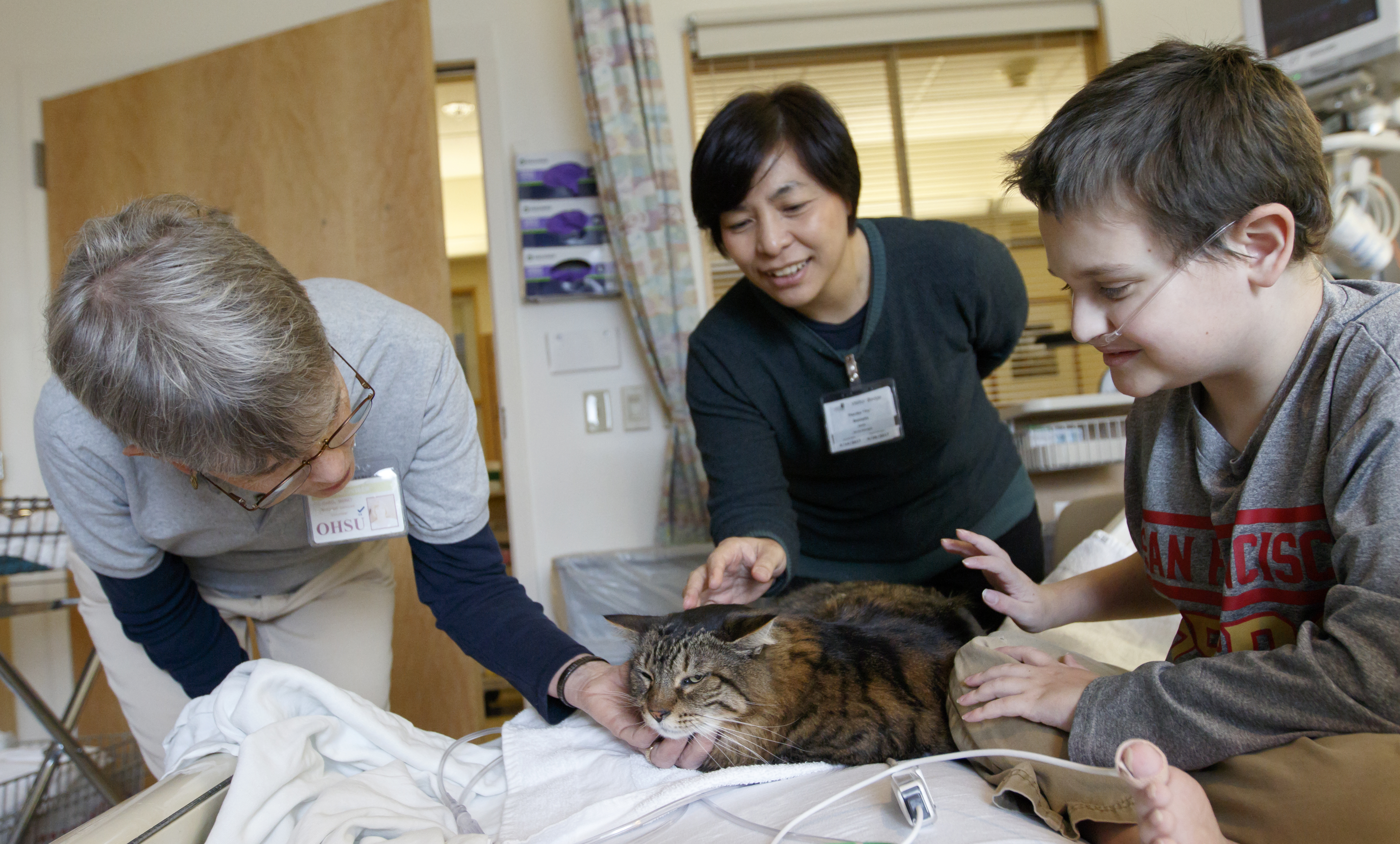 Markt spends one morning a week volunteering with her pet therapy cat, Huck Finn. They are one of 20 pet assisted therapy teams currently volunteering at OHSU.