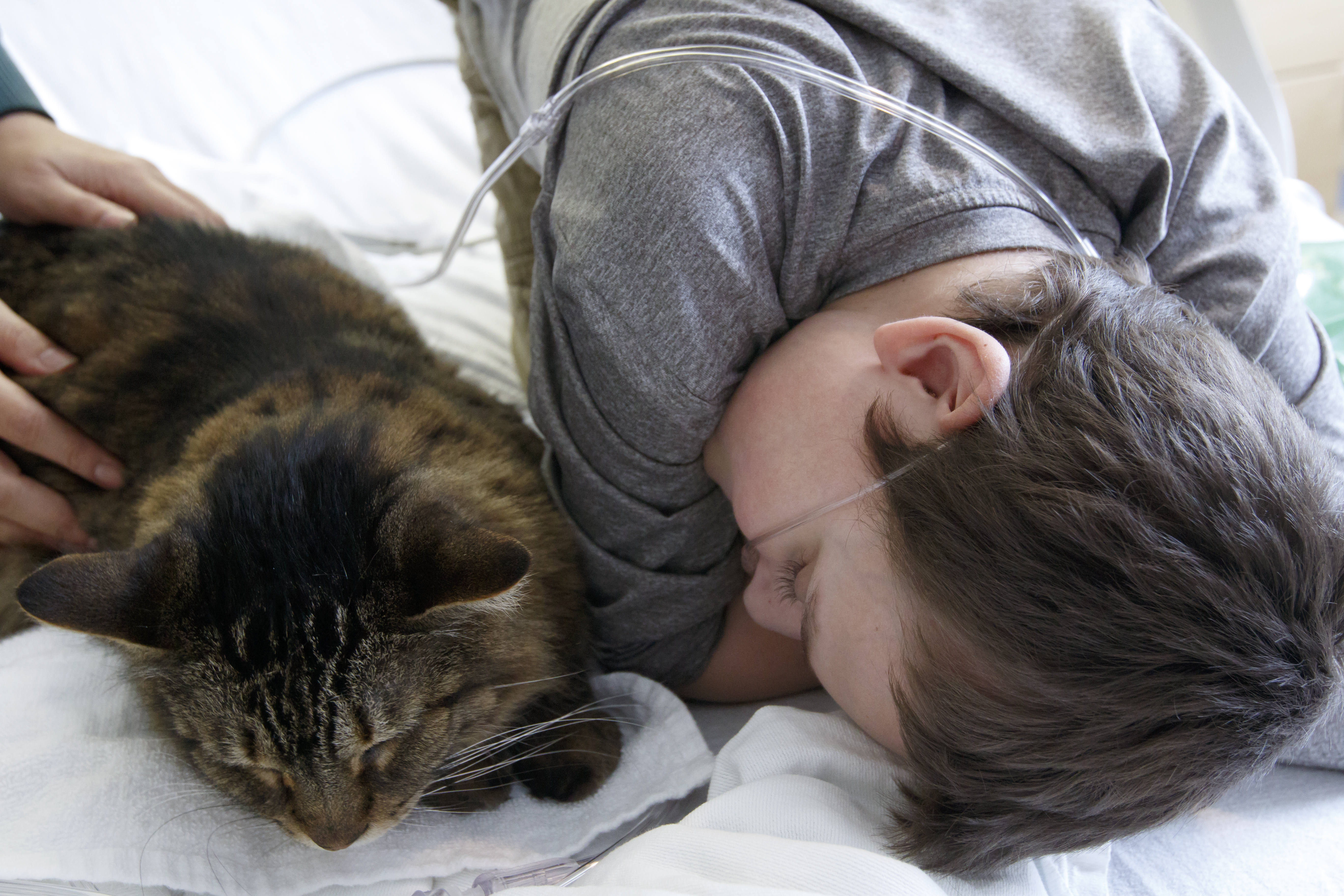 During a recent visit, Markt rolled Huck Finn into Orick Wagner’s room. The child’s face lit up as Markt placed the 15-pound cat on his bed. Orick, 12, buried his face into Huck’s soft fur, his hand gently stroking the cat.