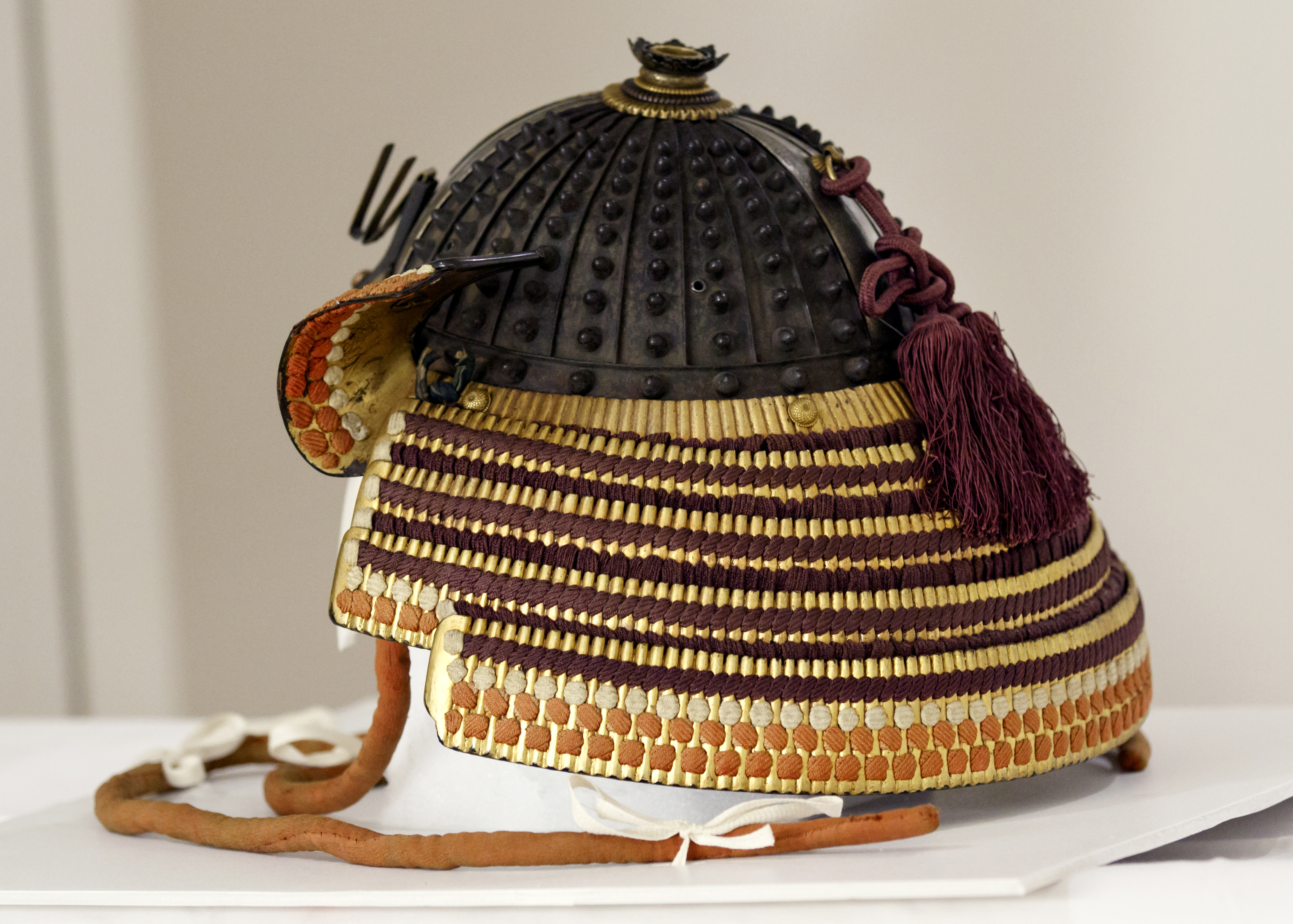 Munemasa incorporated the solid iron pieces into a unified ensemble by adding a cuirass (torso armor), sleeves, skirt and thigh protectors. Those parts were coated entirely in lacquer, masking the underlying material and construction technique.