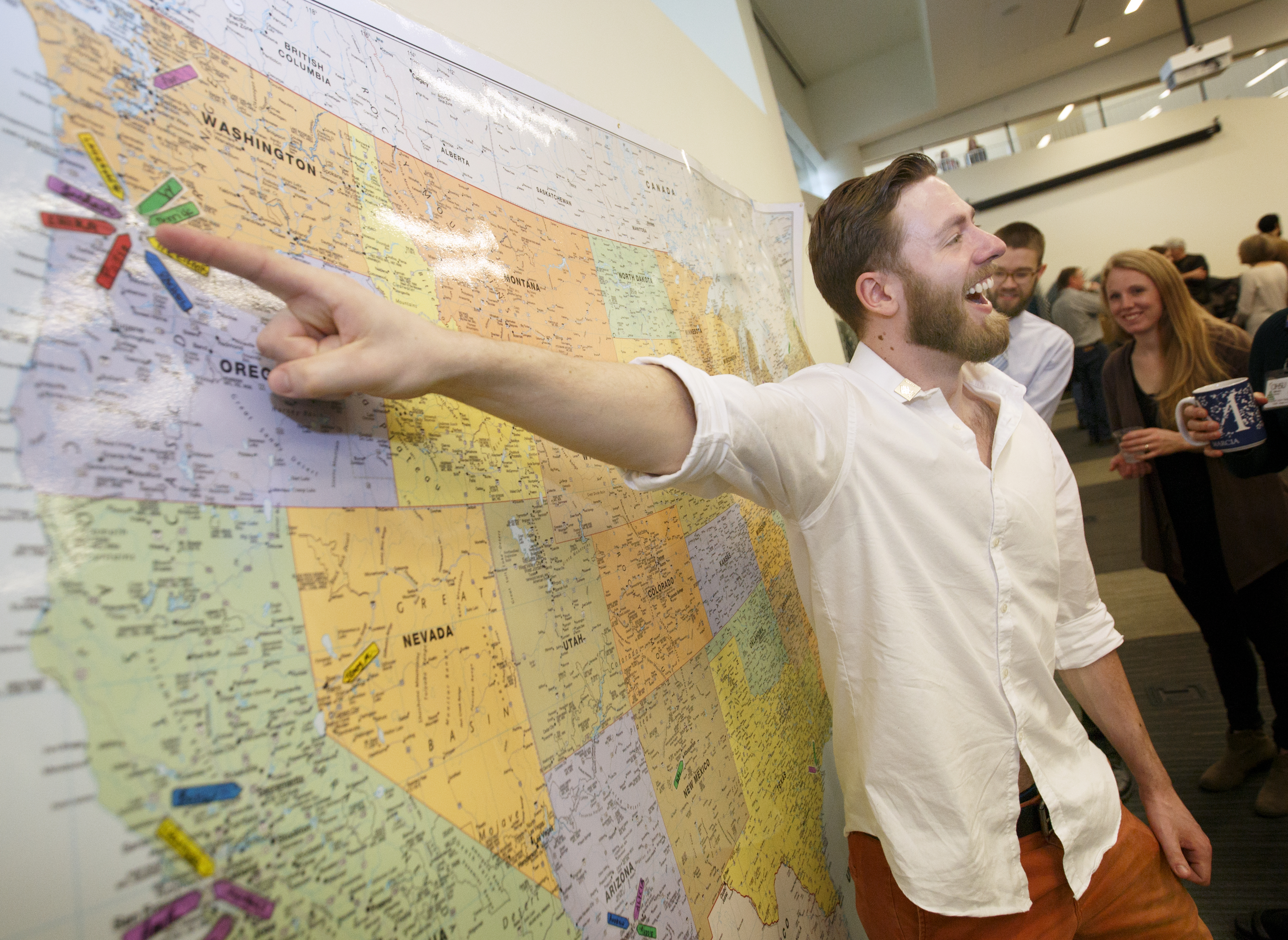 The emcee role is played by Student Affairs Assistant Deans Nicole Deiorio, M.D., professor of emergency medicine, and Ben Schneider, M.D., assistant professor of family medicine, OHSU School of Medicine. At 8:55 a.m., Schneider invited students to come get their envelopes. At exactly 9 a.m., the envelope opening began.