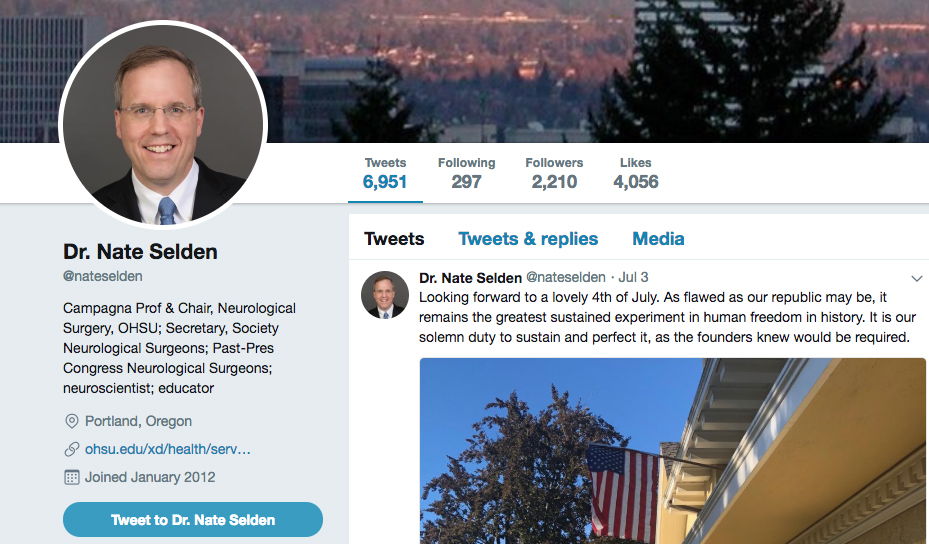 Twitter allows me to communicate with members of the OHSU community from Marquam Hill to the far reaches of Oregon and beyond. Our colleagues, patients, supporters, philanthropists, students and other friends of the program are kind to follow the activities of OHSU neurosurgery. I am glad to relay news of programmatic or scientific advances, and to celebrate the successes of Department of Neurological Surgery members. I also have the chance to relay some personal images and impressions of Oregon, the state where I grew up and where I still love to travel, ski and hike. Twitter does not have the reach of traditional media in terms of volume but is much more impactful in reaching the people most important to our mission.