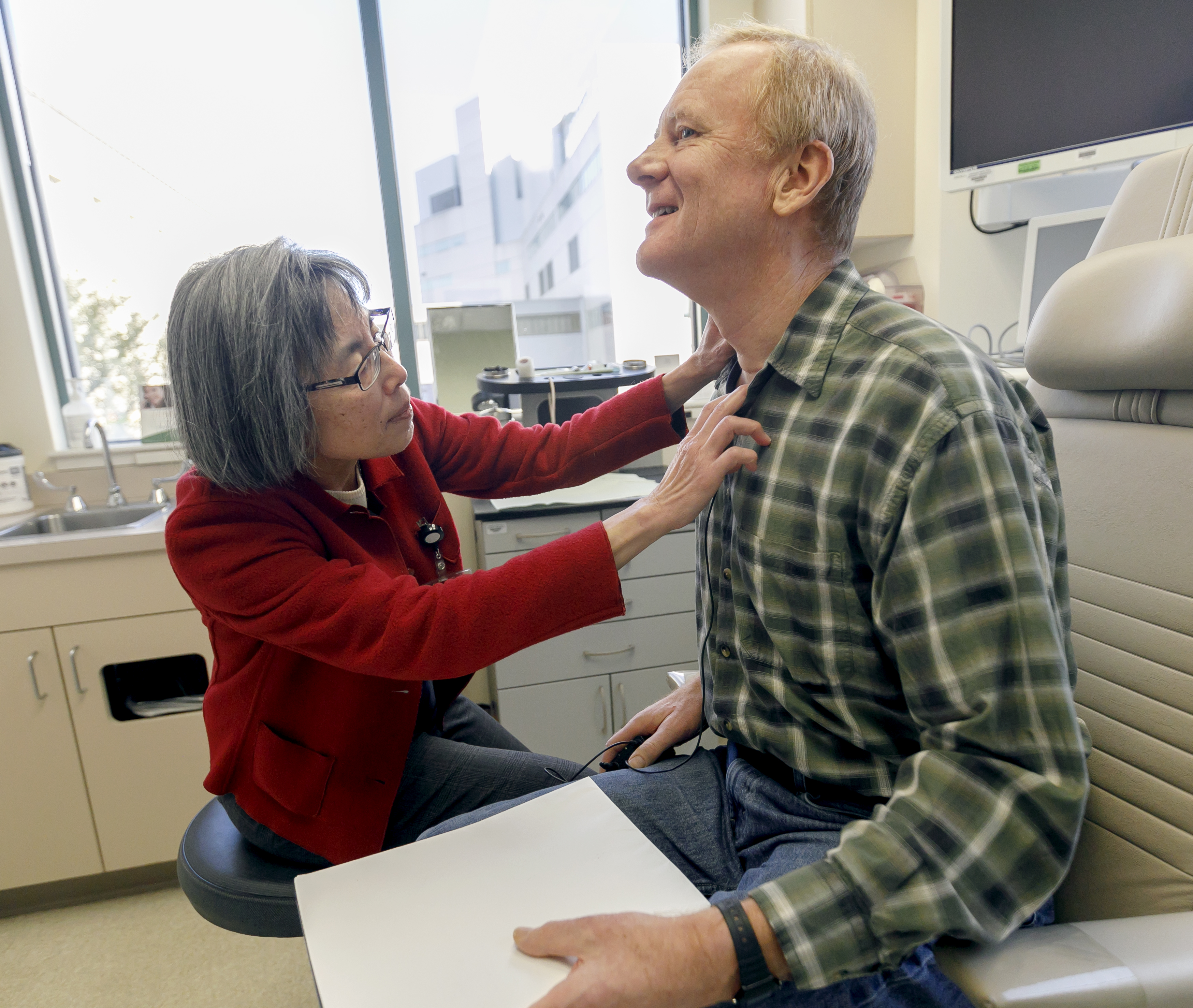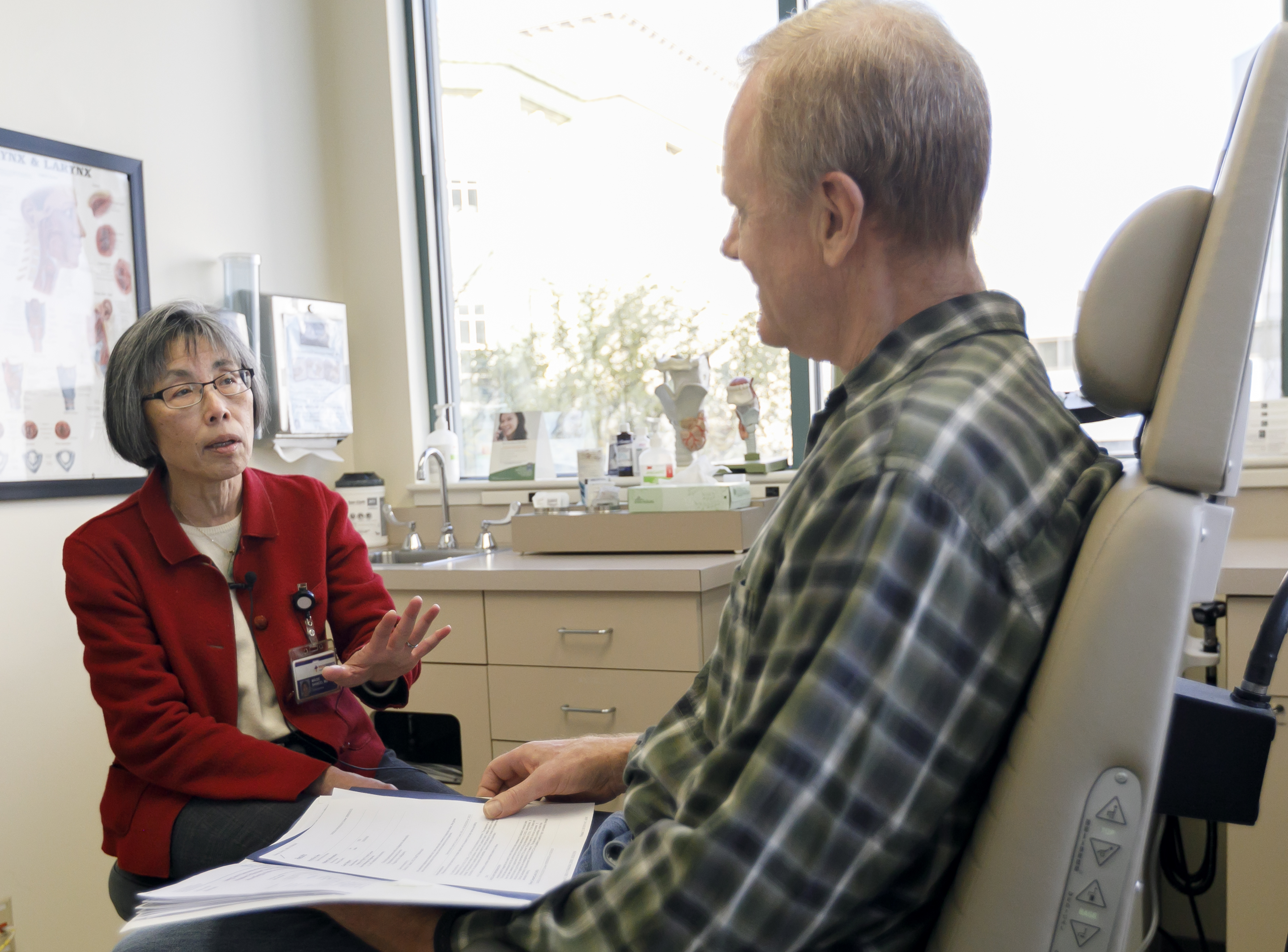 Maisie Shindo, M.D., (left) talks with David Knierim during a follow-up exam, November 2018. (OHSU/Kristyna Wentz-Graff)