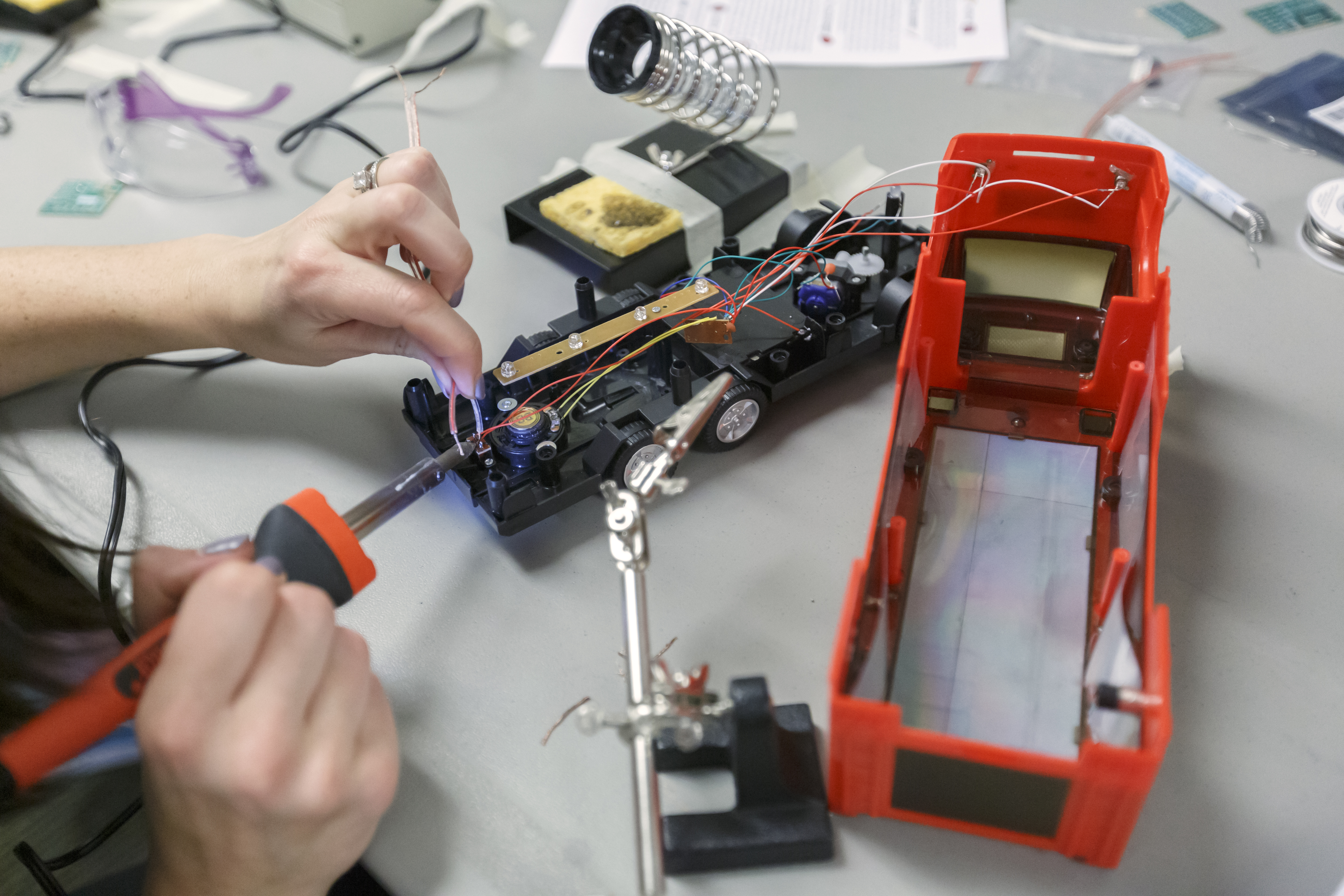 Knowing adapted toys can be cost-prohibitive for some families, volunteers with the Go Baby Go program hold workshops to teach people how to adapt their own toys. All it takes is a few wire changes, a switch and a quick solder.