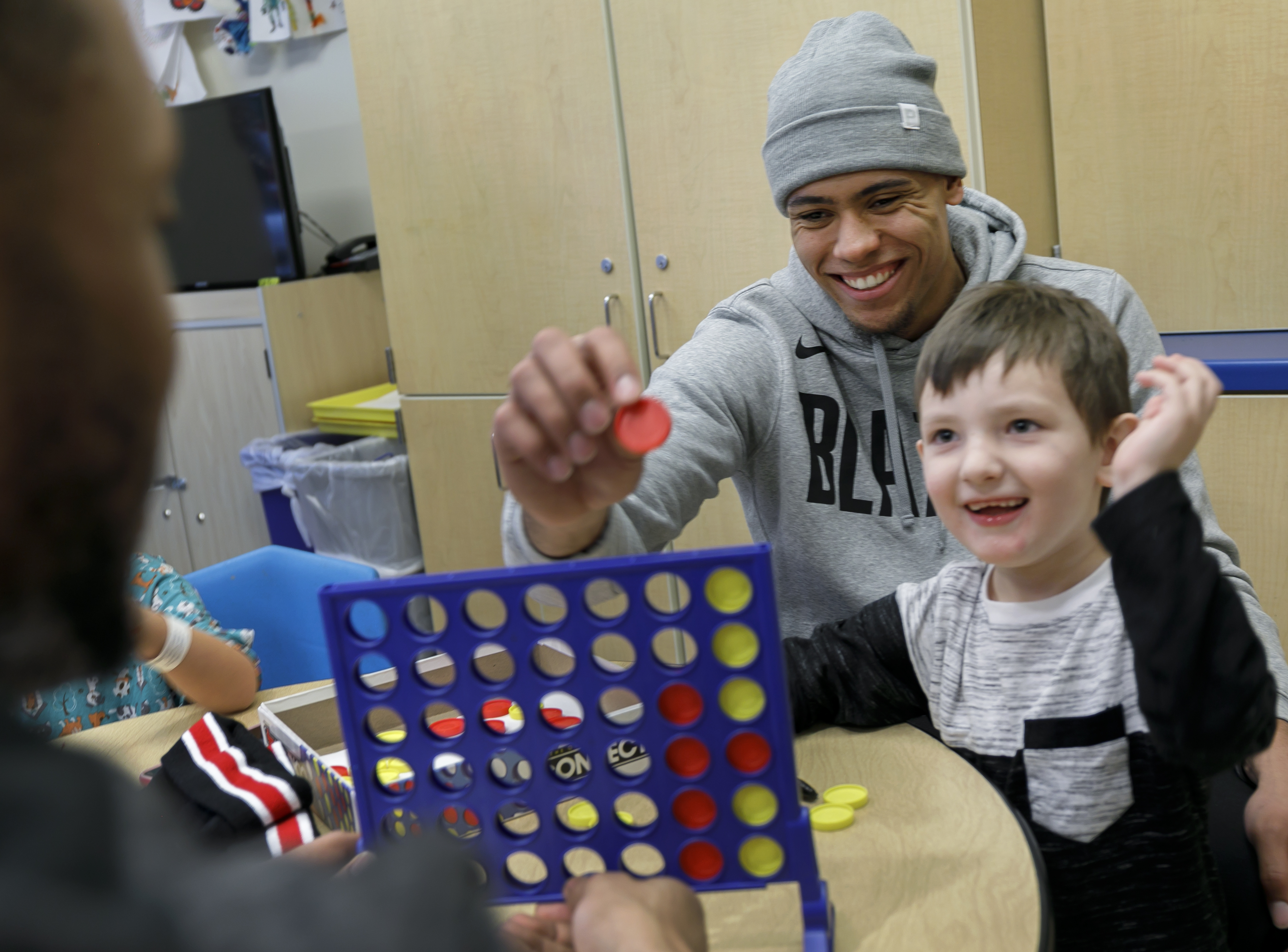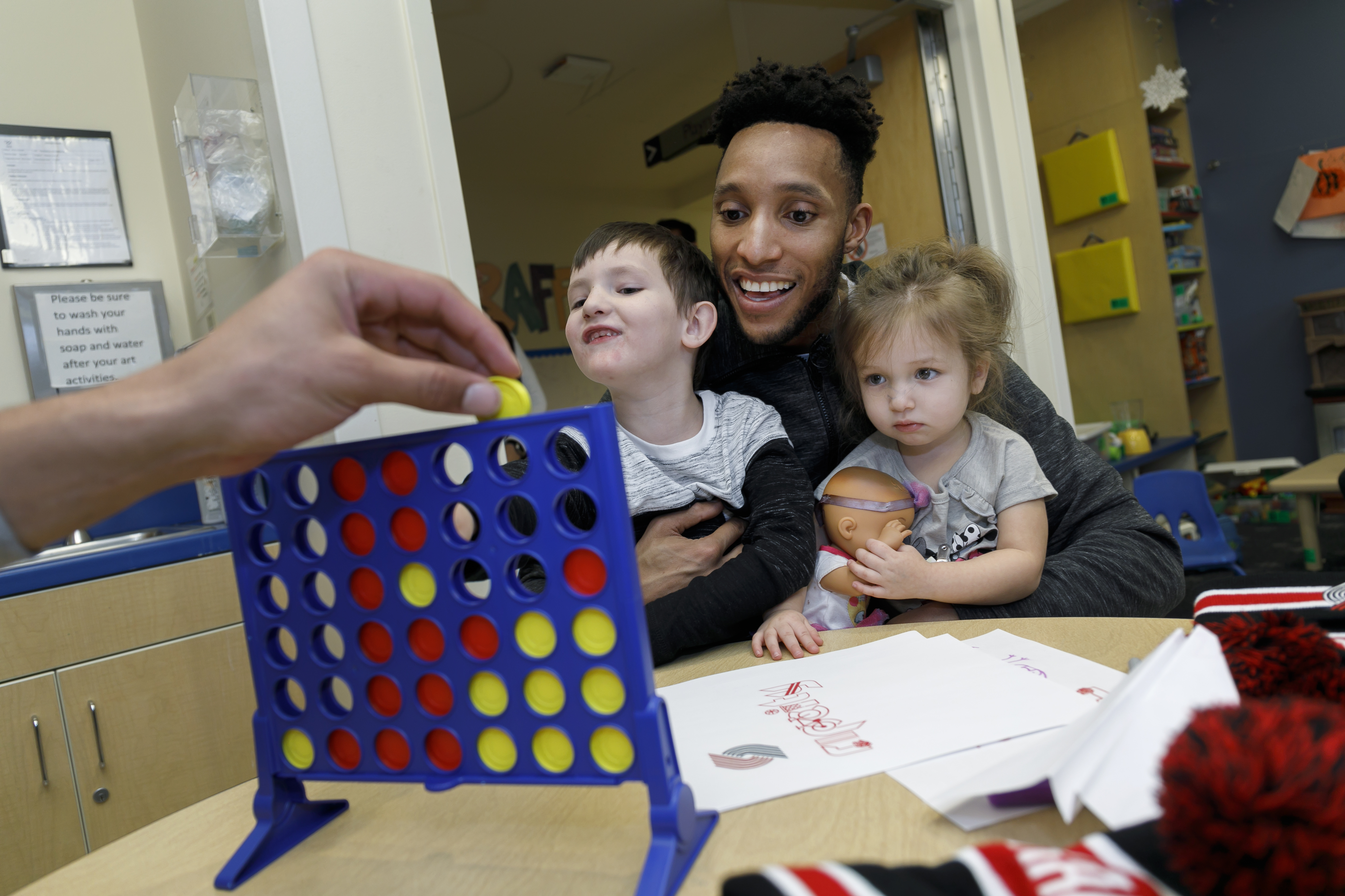 Trail Blazer Evan Turner (center) partners up with Samuel Meeks, (left) and Harmonee Beeler, as members of the Portland Trail Blazers visited families at OHSU Doernbecher Children's Hospital. (OHSU/Kristyna Wentz-Graff)