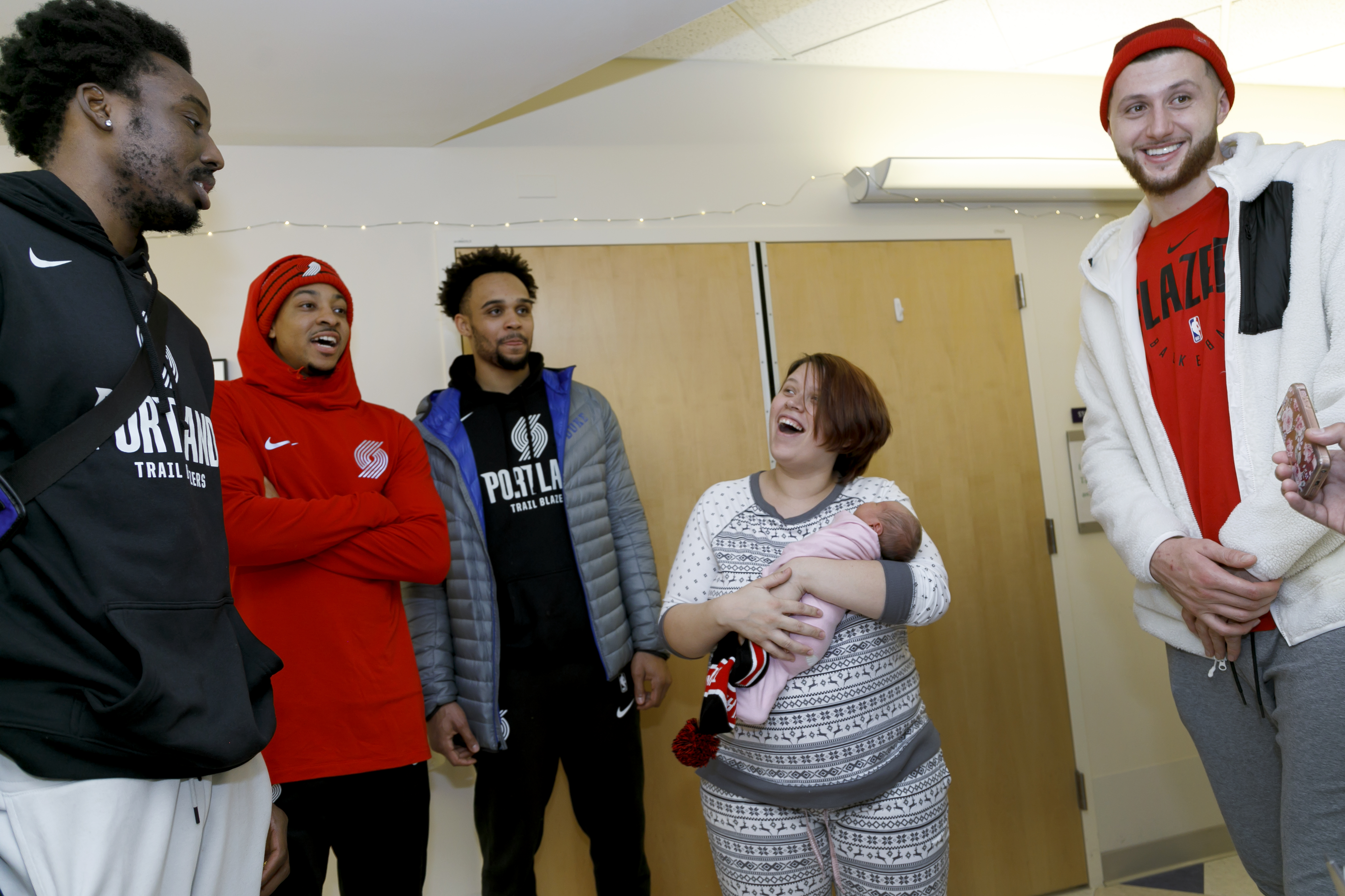 (Left to right) Blazers players Al-Farouq Aminu, CJ McCollum, and Gary Trent, Jr., visit with Sarah Jenkins and her 3-day-old baby Jazmyne Alvarado-Jenkins, along with Jusuf Nurkic. (OHSU/Kristyna Wentz-Graff)
