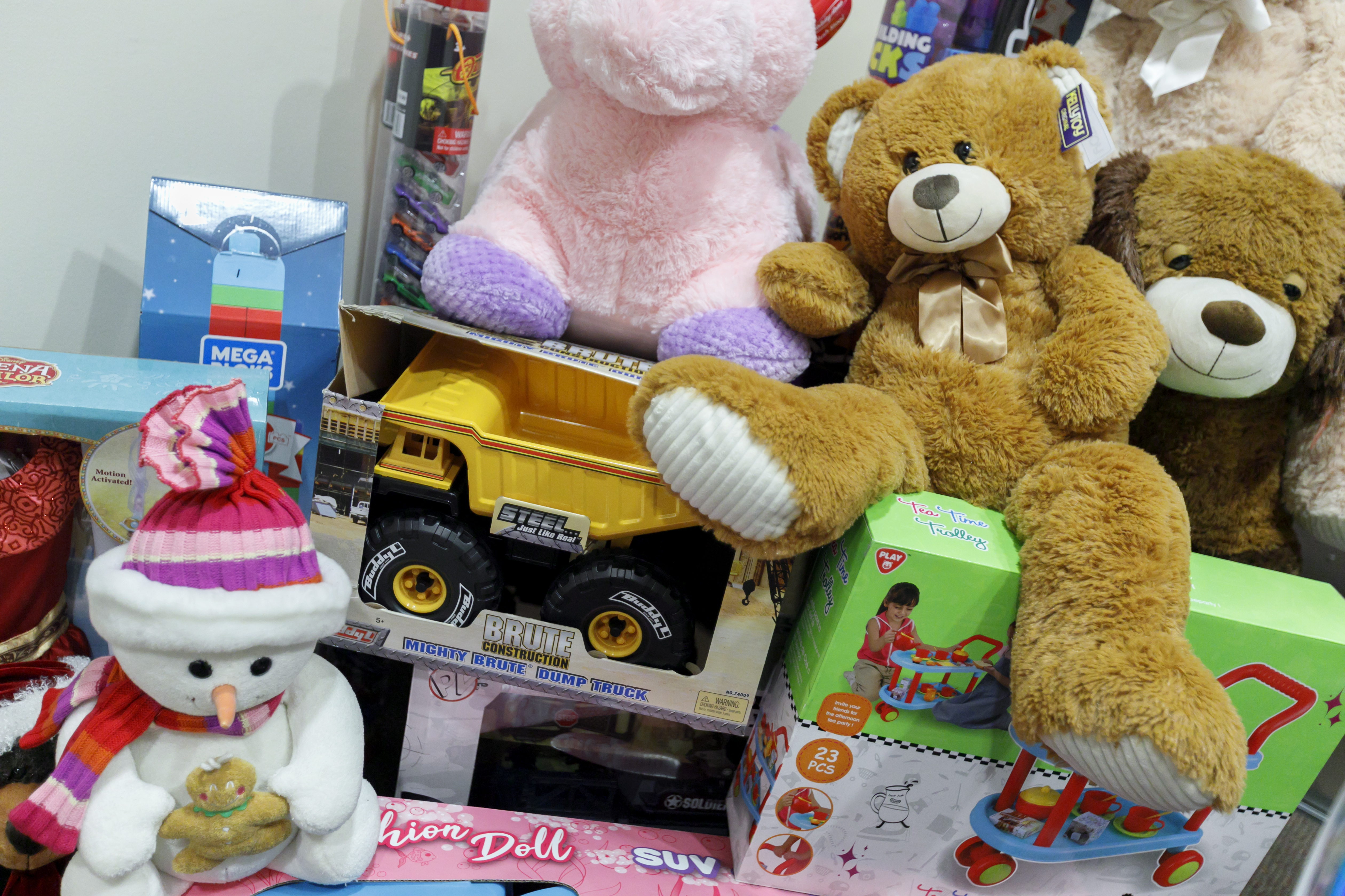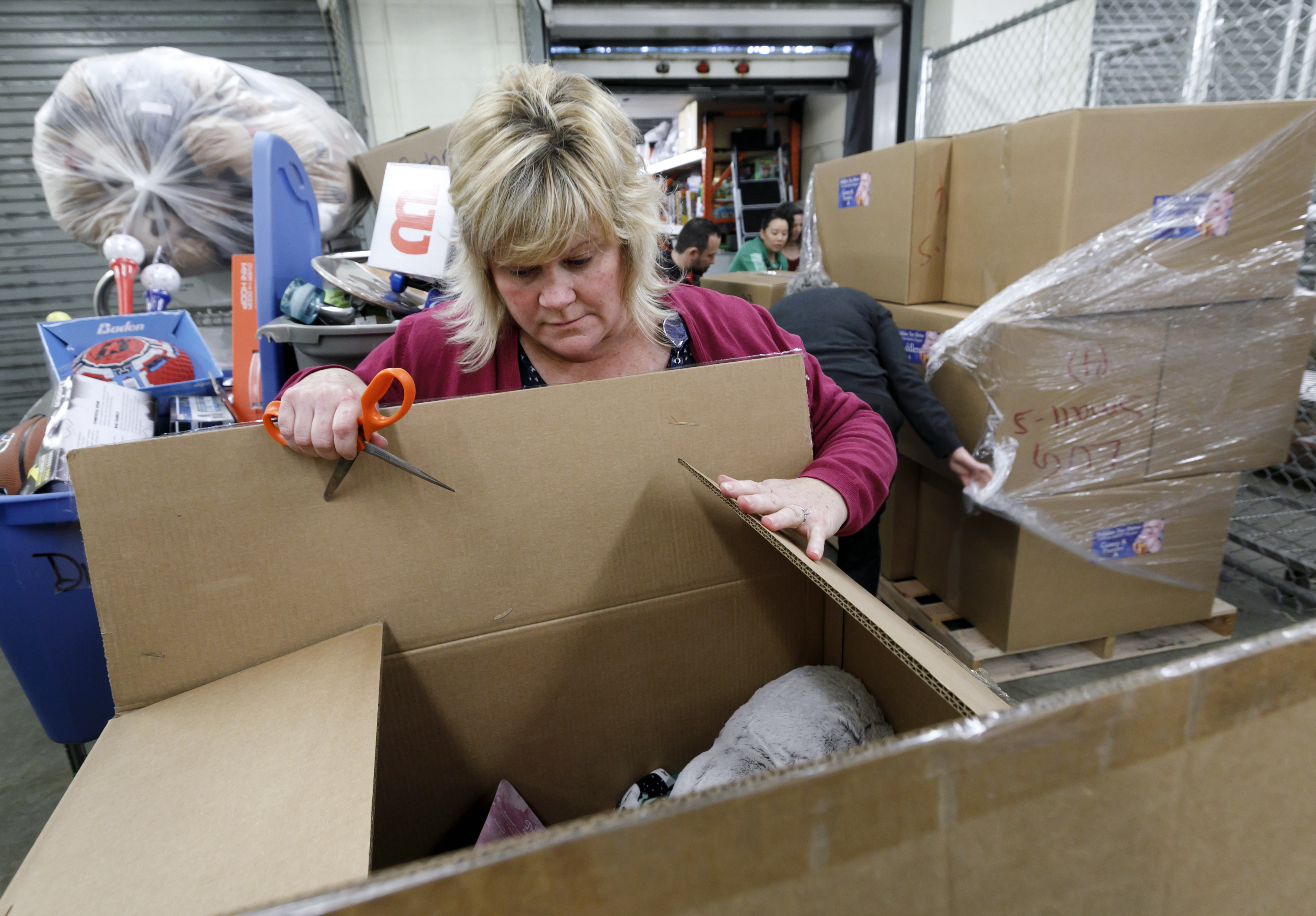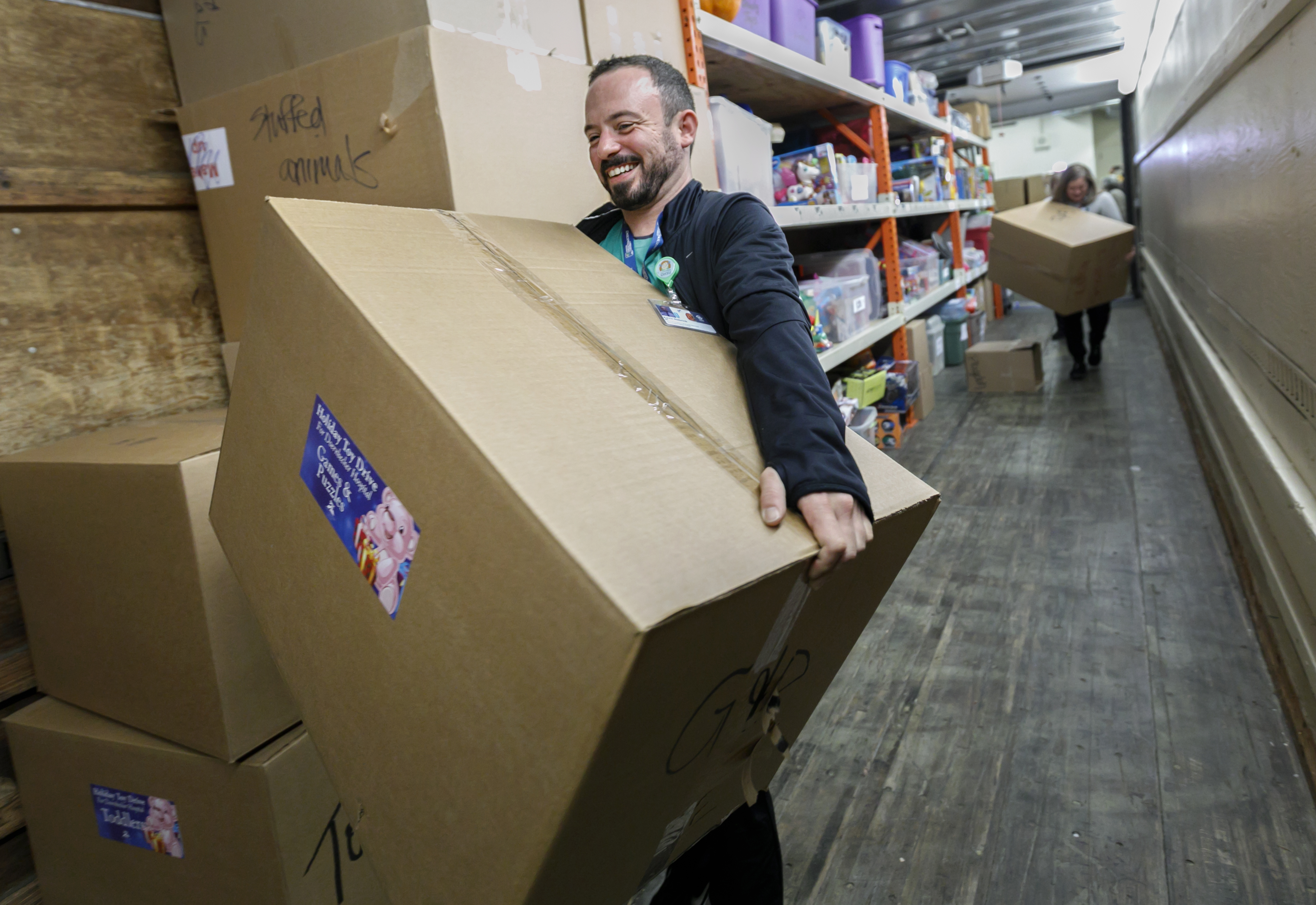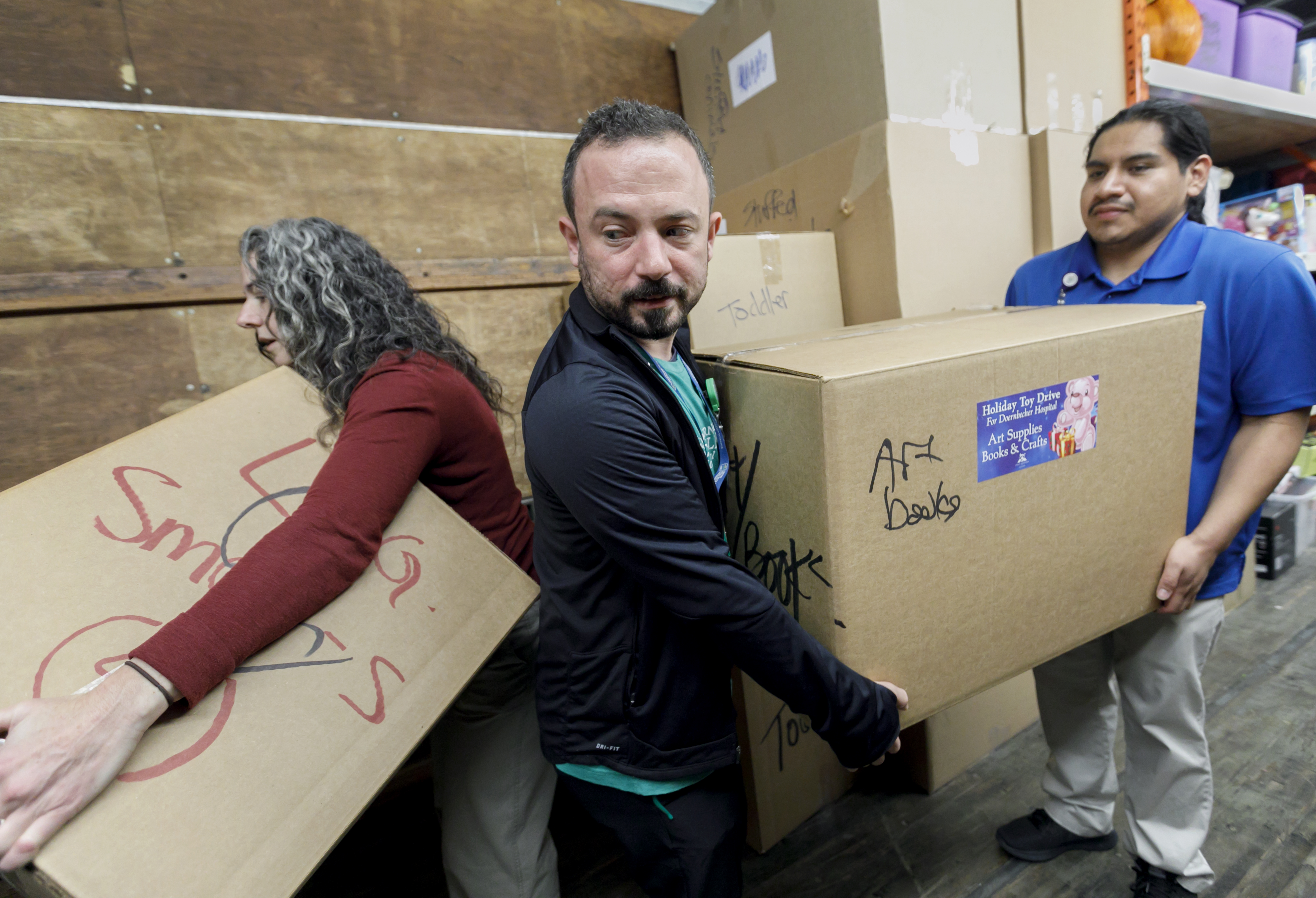 Spirit Mountain Casino employees arrange toys donated to OHSU Doernbecher Children's Hospital on December 17, 2018. The is the 12th year the casino has sent over a truckload of toys. (OHSU/Kristyna Wentz-Graff)