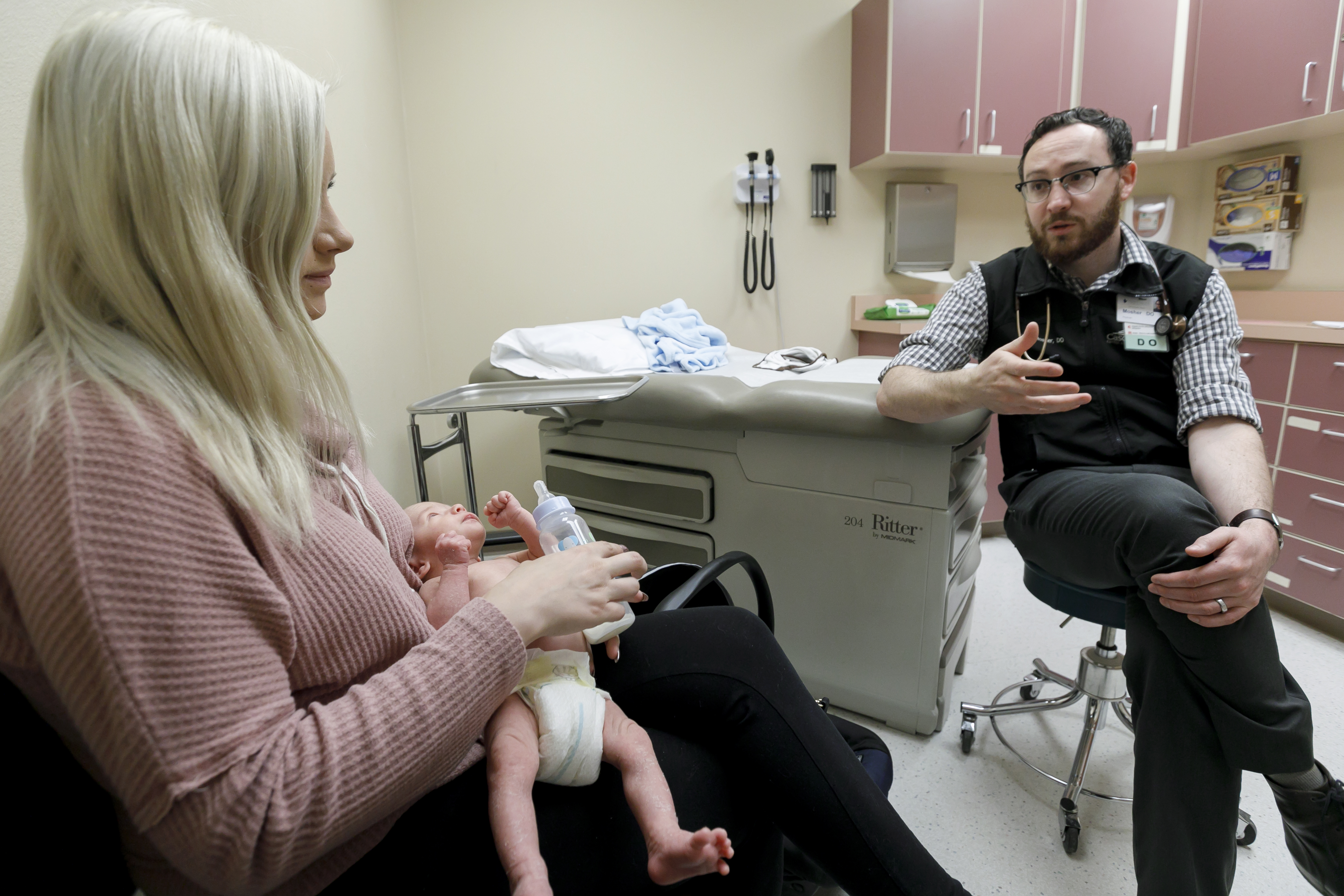One-month-old Hunter Schilling of Sprague River is examined at the OHSU-Cascades East clinic. A new grant will reshape the residency program at this clinic, with a focus on improving health access in rural, tribal, urban and other communities that lack resources. (OHSU/Kristyna Wentz-Graff)