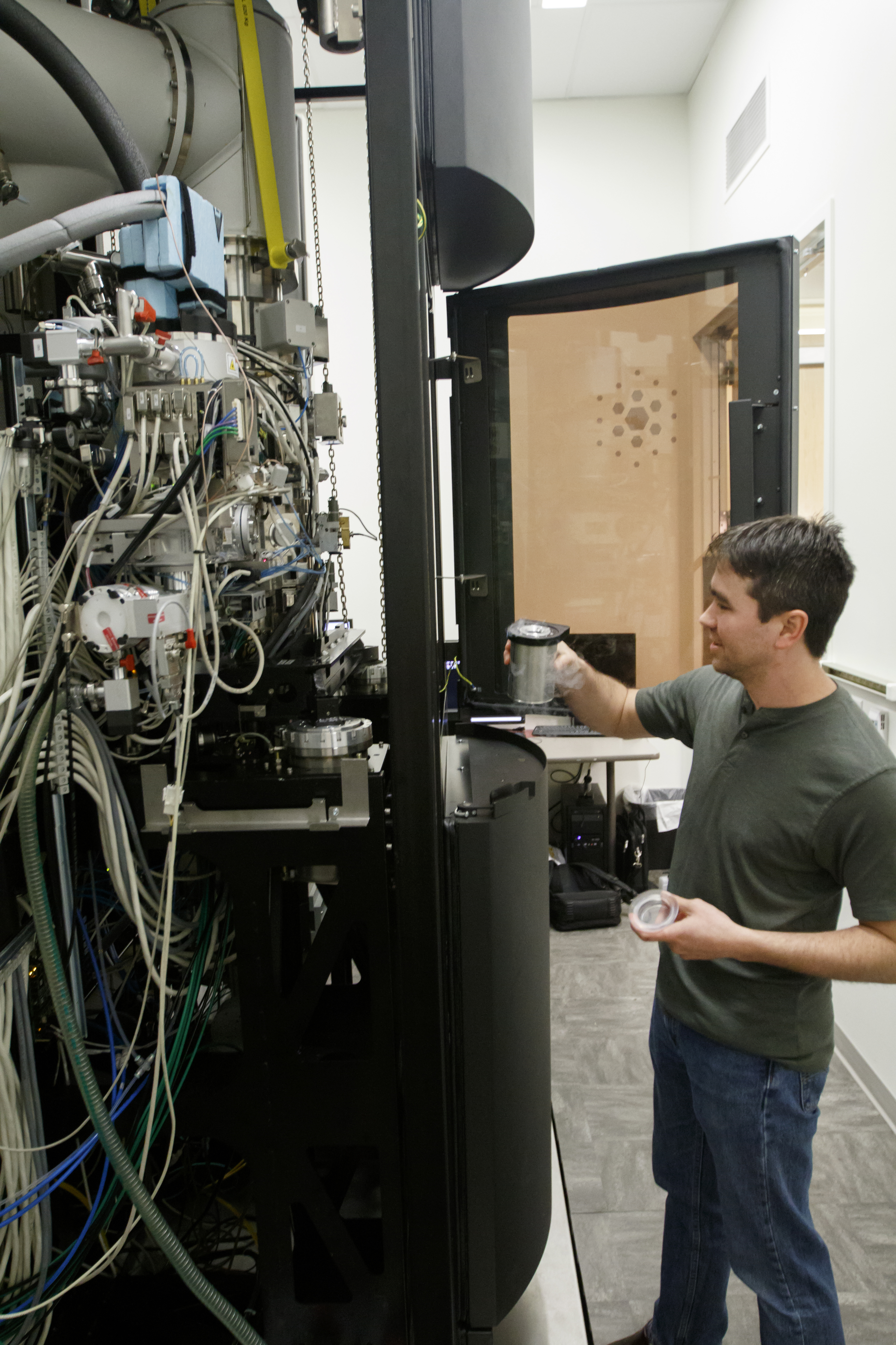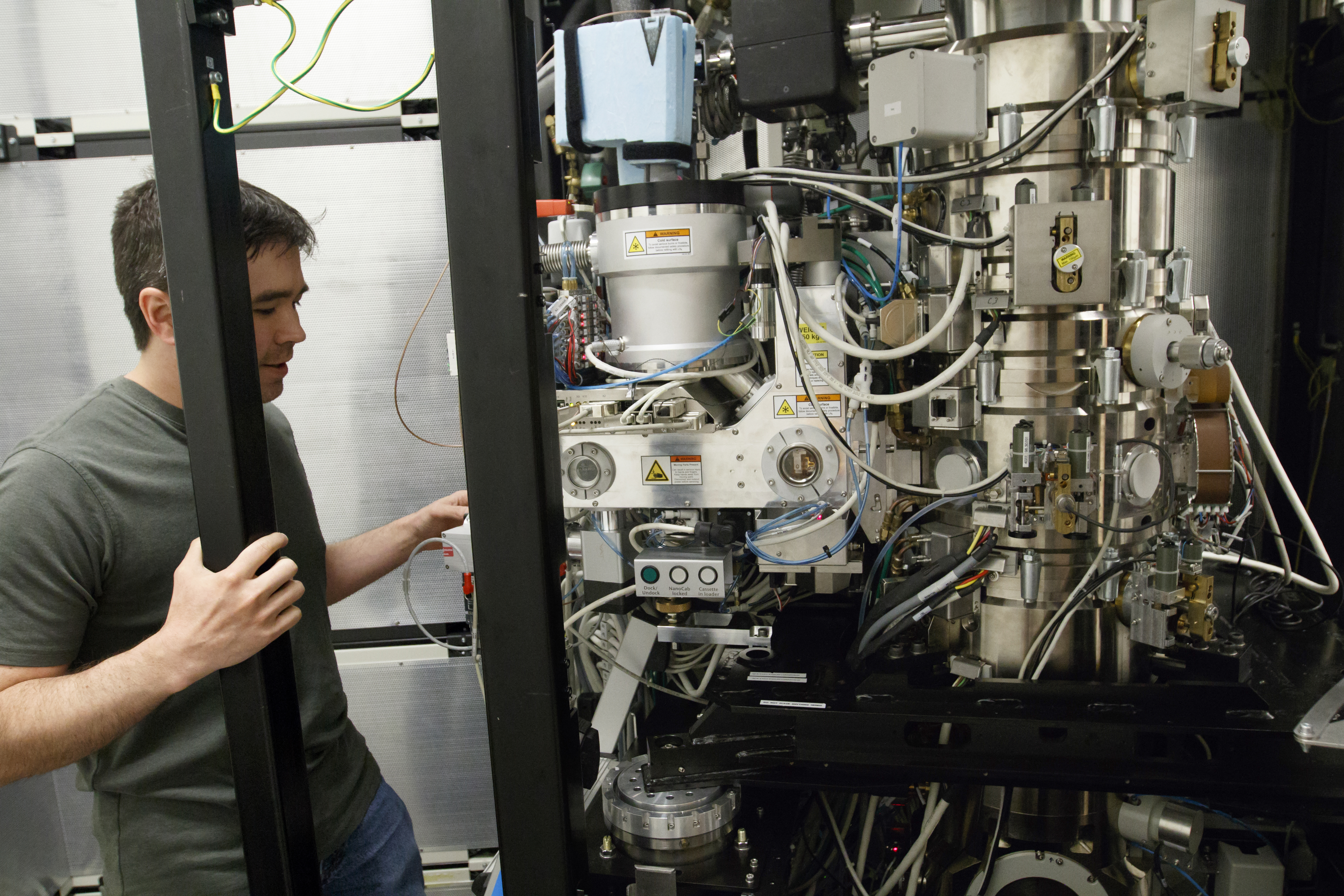 man on left side of image, looking into giant cryo-em microscope