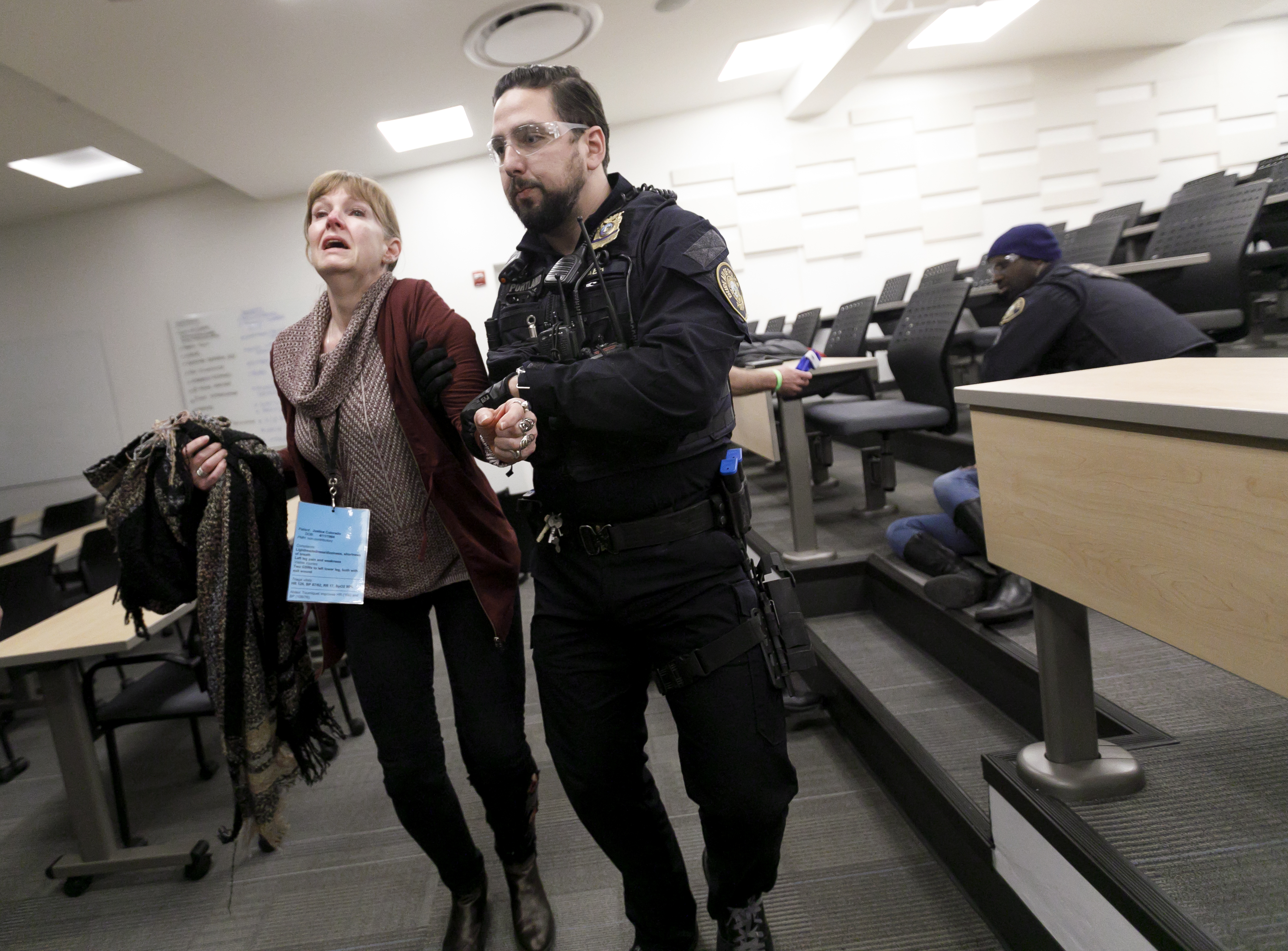 An OHSU Police officer (left) and Portland Police officer bring out a mock victim during the training. (OHSU/Kristyna Wentz-Graff)