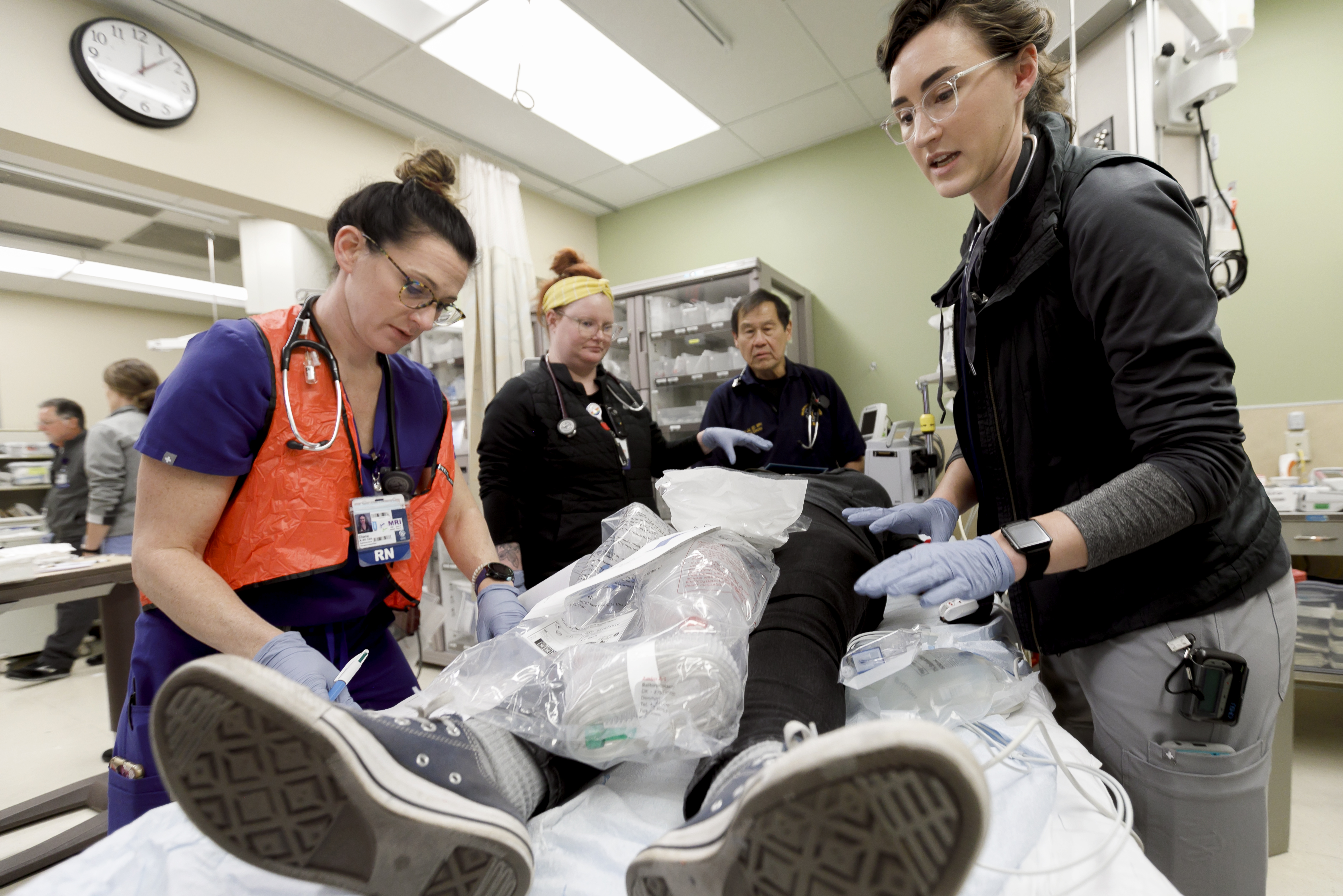 Medical teams in the emergency department treat the "victim" based on a simulated condition presented on a card the victim is wearing.