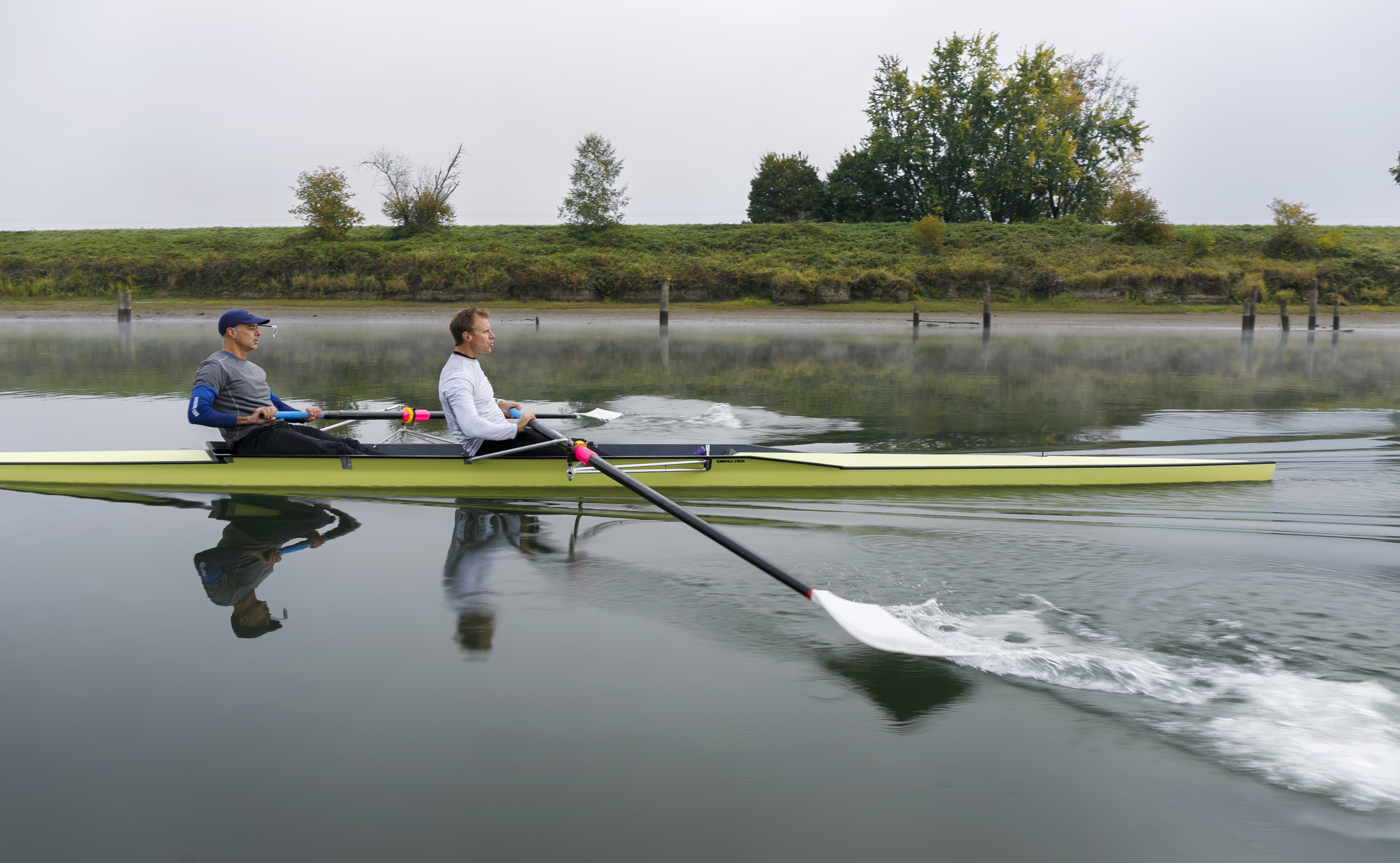 Rowing on calm water on a foggy morning