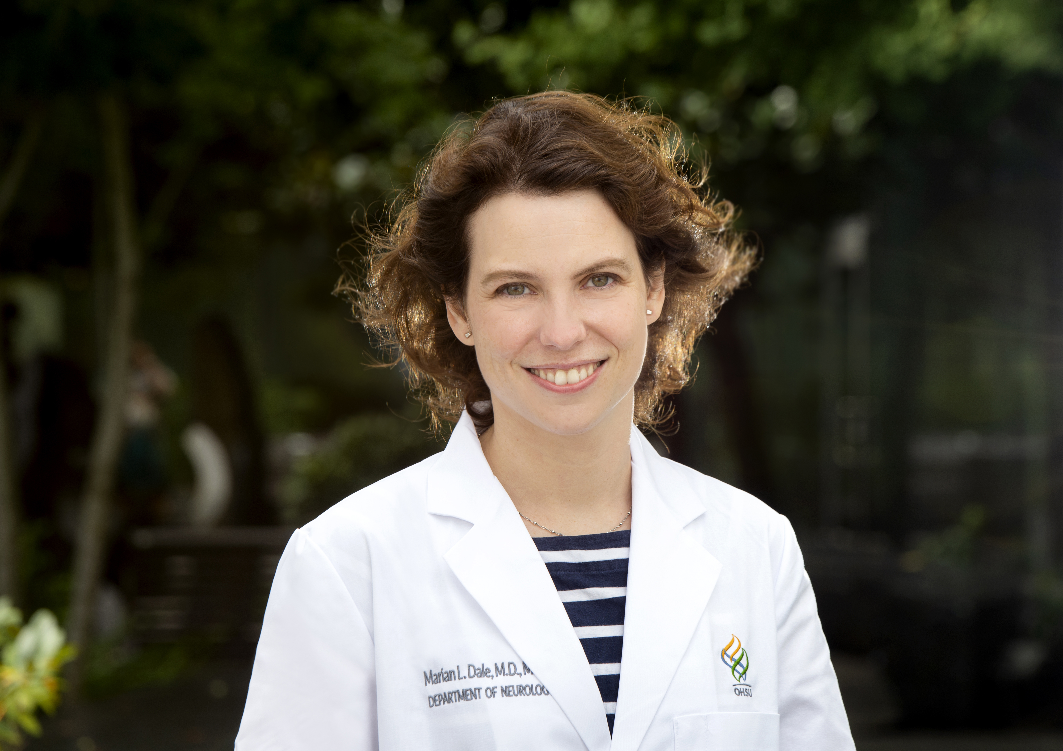 Portrait of Marian Dale, M.D., M.C.R., a smiling brunette woman wearing a white lab coat with her name and the OHSU logo embroidered on the right and left chest respectively.
