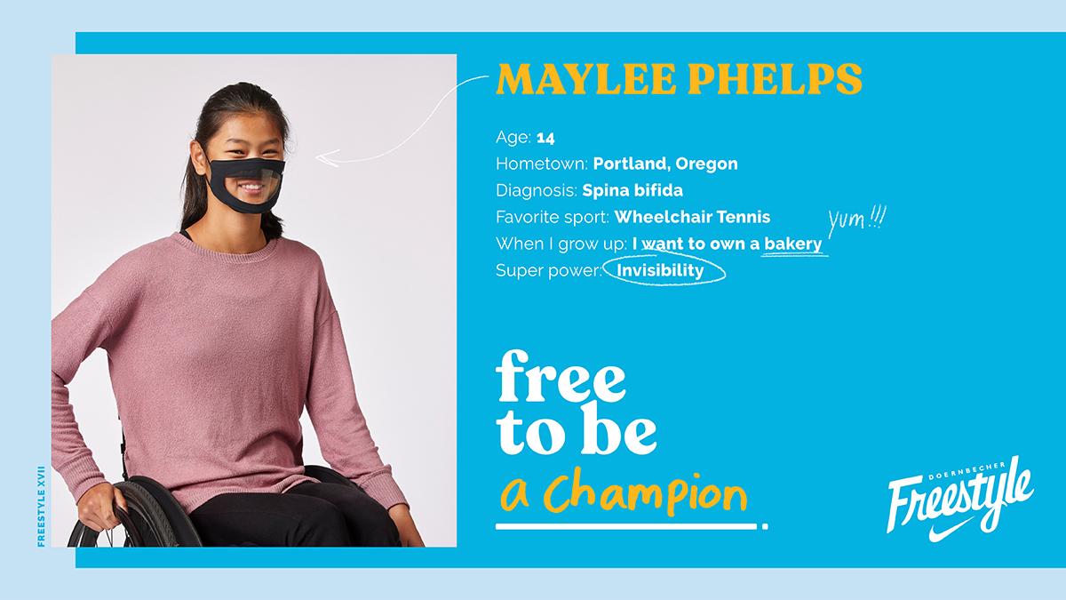 Graphic including photo, bio of Doernbecher Freestyle XVII patient-designer Maylee Phelps. A girl with dark hair pulled back and a pink shirt.