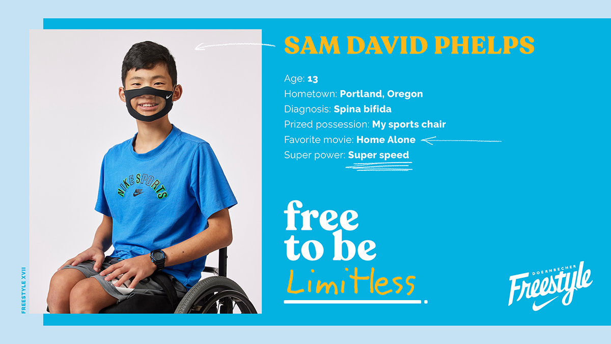 Graphic including photo, bio of Doernbecher Freestyle XVII patient-designer Sam David Phelps. A boy with short dark hair and a blue shirt.